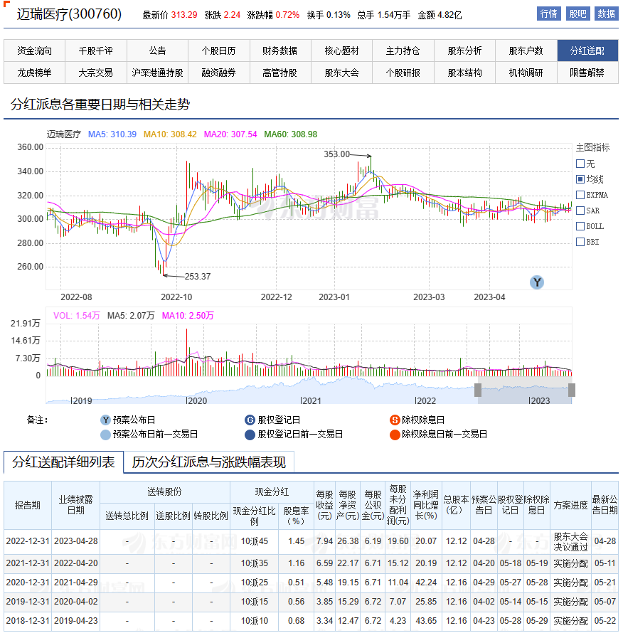 2022年医药股“一哥”迈瑞医疗在业绩创新高的同时,现金分红也毫不吝啬,总额突破60亿元。不久前,迈瑞医疗在2022年度利润分配预案公告指出,拟10股派发现金股利45元(含税),现金分红金额54.56亿元,占净利润比例超过50%,这是公司上市以来的第5次现金分红。迈瑞医疗表示,公司自上市以来共计现金分红金额超过150亿元,并且分红比例持续提升。除每年进行现金分红外,公司还进行2次金额均为10亿元的股份回购。未来,公司会继续加强经营、提升业绩,为股东创造更大价值,并视公司发展需要和市场环境综合采用利润分配、股份回购等方式持续回报投资者。2023年一季度,公司营收83.64亿元,净利润25.71亿元,同比增长均超过20%。