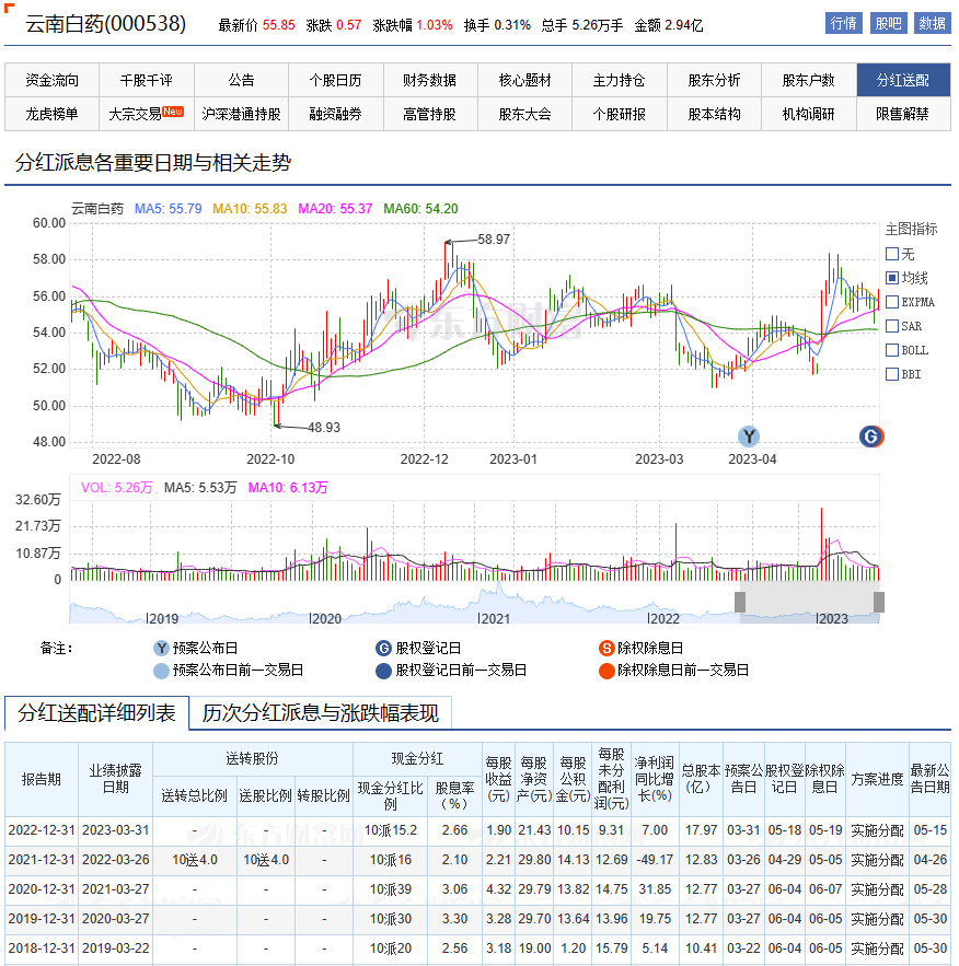 5月15日,云南白药发布2022年度权益分派实施公告,向全体股东每10股派发现金红利15.2元(含税)。现金分红总额34.20亿元,其中现金分红金额27.12亿元。云南白药表示,不断创造价值并对投资者予以合理的回报是公司长期关注和践行的重点,公司实行持续、稳定的利润分配政策,在发展阶段属成熟期且无重大资金支出安排,进行利润分配时,现金分红在此次利润分配中所占比例最低应达到80%。