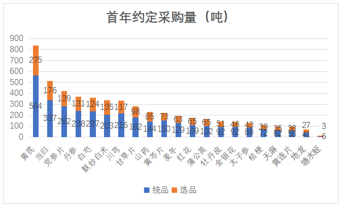 从品种方面分析,本次联采的21个饮片品种,覆盖了临床诊疗常用的30种中药饮片的一半,主要以大品类为主。其中,黄芪、当归的采购量最大,黄芪首年约定采购量为839吨(统货:564吨、选货:275吨),当归采购量为513吨,成为了唯二两款采购量超过500吨的品种。