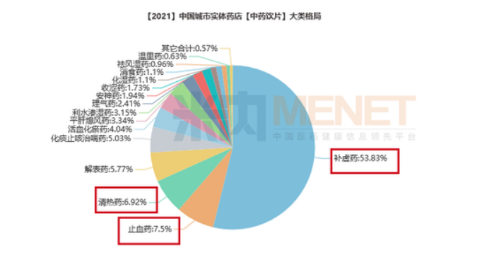 根据米内网统计数据来看,2021年中国城市实体药店中药饮片的大类格局前10大类中,补虚药、止血药、清热药多年来稳居前三,其中补虚药独占鳌头,市场份额超过50%,且有逐年递增的态势,中药饮片TOP20的品种也大多为补虚药。