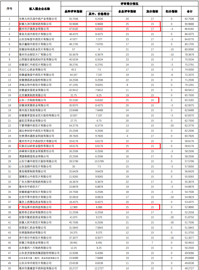 据悉,在此前评选入围竞价环节的企业评选中,在品种供应能力、联盟采购需求和联盟医药机构覆盖三方面具有区域报量优势的企业评分普遍较高。如安徽九州方圆、石家庄以岭、康美药业、山西振东、青岛天成、山东一方等在中药材前端种植布局的大型企业,在企业评审指标上更具有得分优势。