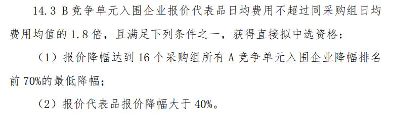 在正式文件的规定下,A组竞争单元入围企业报价代表品申报价计算的日均费用不超过同采购组日均费用均值的1.8倍,且满足下列条件之一,获得直接拟中选资格: