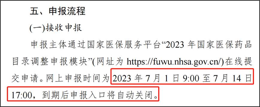如往年一样,2023年国家药品目录调整分为准备、申报、专家评审、谈判、公布结果 5个阶段。今年申报方式统一采取网上申报,无需邮寄纸质申报材料。申报不收取任何费用。