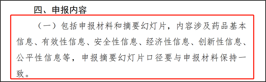 其中,申报内容包括申报材料和摘要幻灯片,内容涉及药品基本信息、有效性信息、安全性信息、经济性信息、创新性信息、公平性信息等,申报摘要幻灯片口径要与申报材料保持一致。