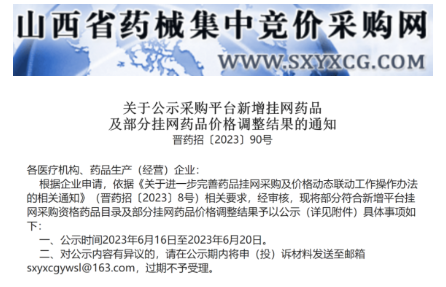 山西省药械集中招标采购中心发布通知,公示采购平台新增挂网药品及部分挂网药品价格调整结果,本批目录共有1828个品规价格有变化。