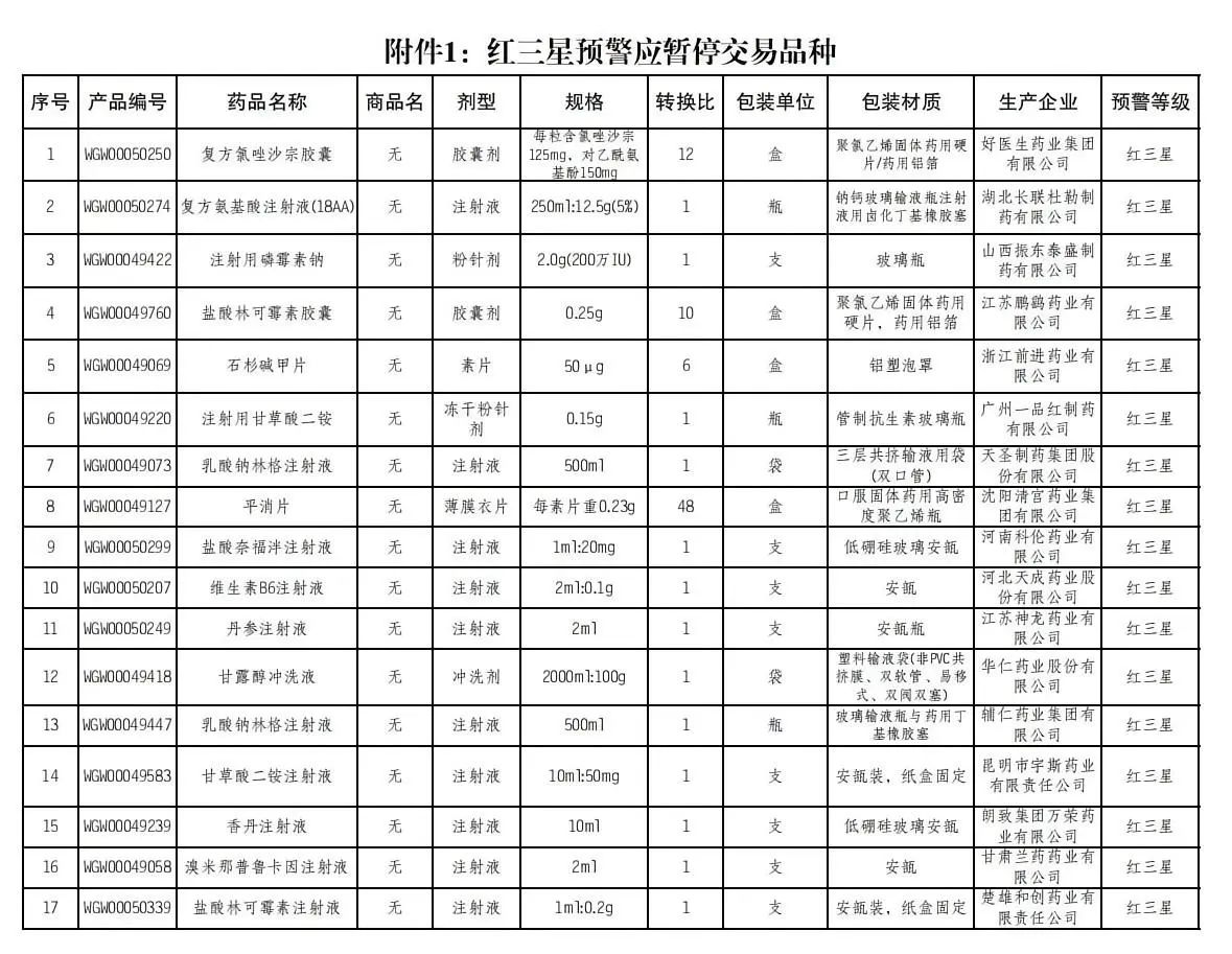江苏省医保局此前发布的《关于深入推进药品阳光采购的实施意见》提出,价格高于阳光采购制度实施时已挂网同品种最高价10倍(含)及以上的,标记为红色预警★★★,暂停该产品交易资格,医疗机构原则上不得采购。