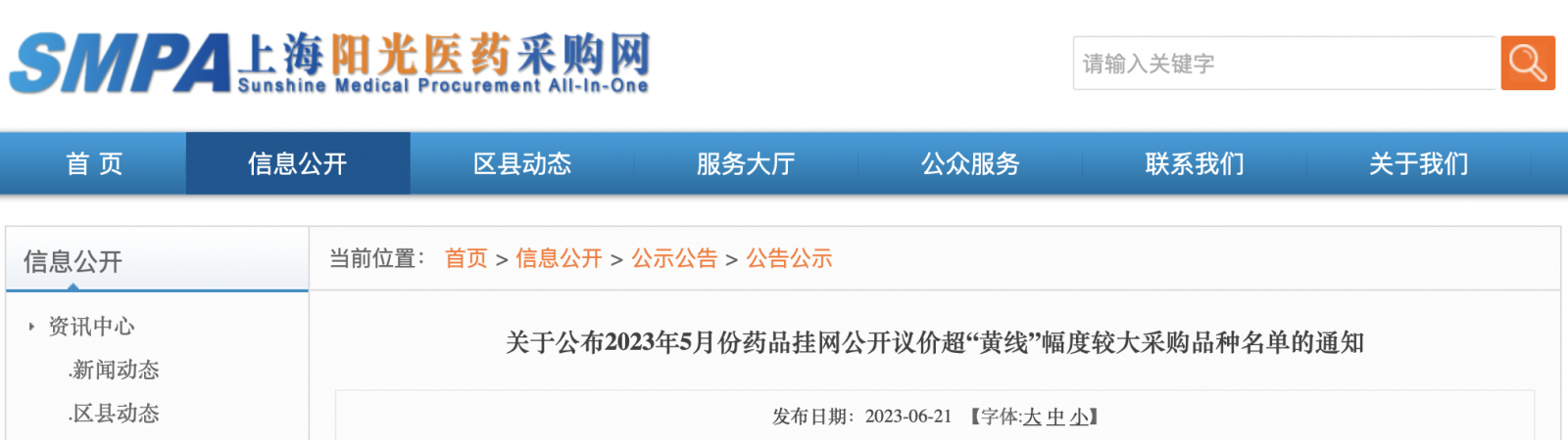6月21日,为进一步加强药品挂网公开议价采购的监管工作,上海阳光医药采购网发布《关于公布2023年5月份药品挂网公开议价超“黄线”幅度较大采购品种名单的通知》,对2023年5月份挂网公开议价超“黄线”幅度排名靠前且有一定采购金额的品种予以公布。