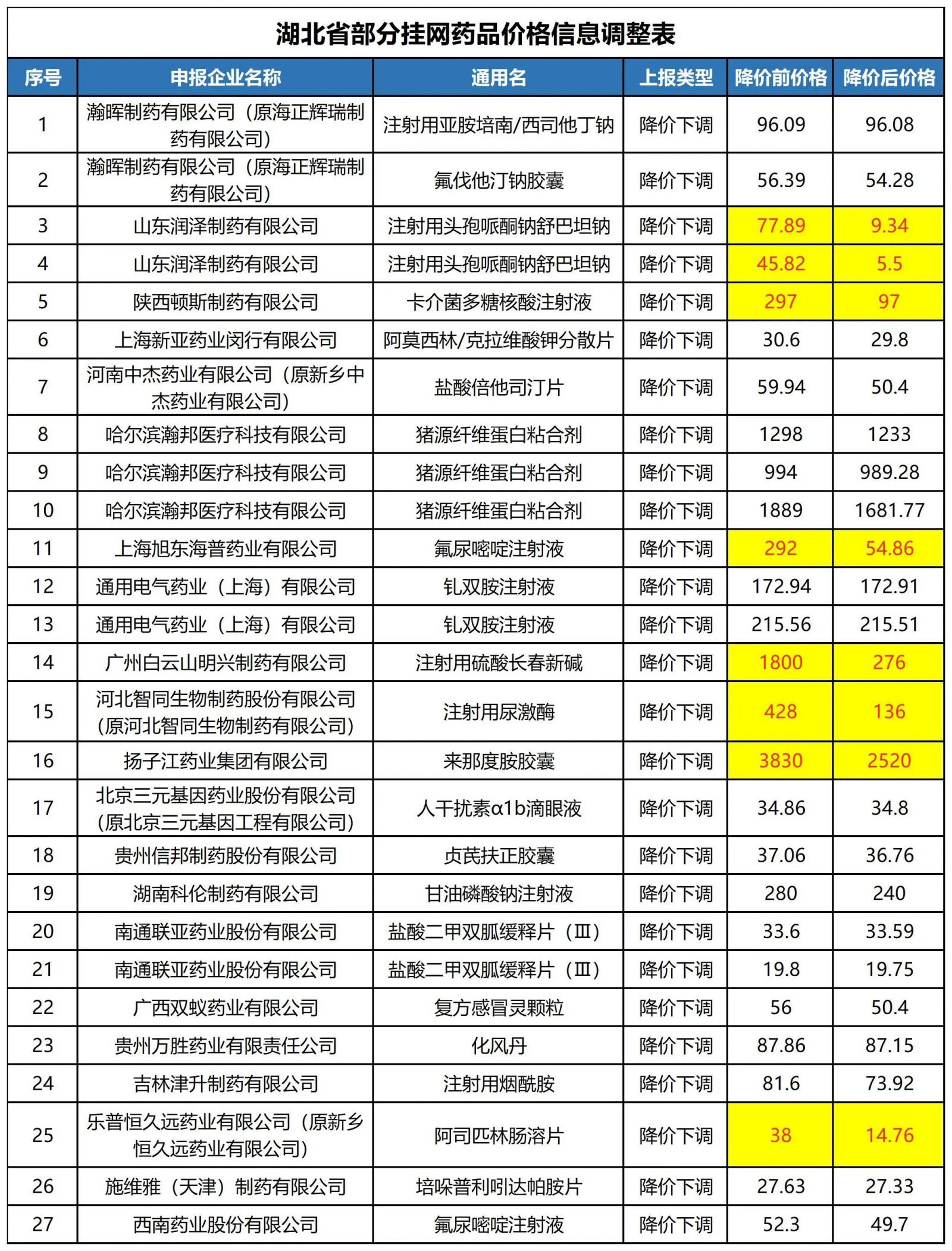 6月7日,贵州省医疗保障局发布了2023年第十六批33个药品挂网交易价格调整表。公告显示,近期,安徽宏业药业、山西旺龙药业、江西济民可信等16家企业,在贵州省医疗保障信息平台药品和医用耗材招采管理子系统提交了33个药品的降价申请。