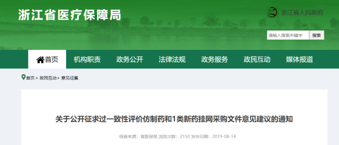 2019年,浙江省医保局曾发布《关于公开征求过一致性评价仿制药和1类新药挂网采购文件意见建议的通知》,拟订了《浙江省医疗保障局关于进一步做好通过质量和疗效一致性评价仿制药挂网采购工作的通知(征求意见稿)》。