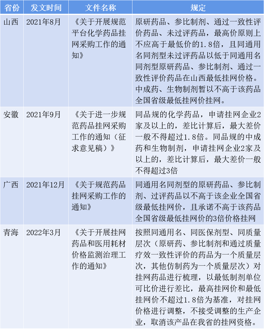 早在2020年10月31日,河北就发布了《河北省医疗保障局关于进一步做好药品挂网工作的通知》。明确在河北省挂网的药品(除国家谈判药品、国采药品、河北省采药品外),需满足:原研药、参比制剂、通过一致性评价药品价格高于未通过一致性评价的药品;且原研药、参比制剂、过评、未过评药品以不高于全国最低挂网价直接挂网;对于同通用名同剂型同质量层次的化学药品,申请挂网企业2家及以上的,差比计算后,最大差价一般不得超过1.8倍;同品种同质量层次的中成药、生物制剂申请挂网企业2家及以上的,差比计算,最大差价一般不得超过3倍;存在包材差异的可以参考现有规则,保持合理的差比价关系。