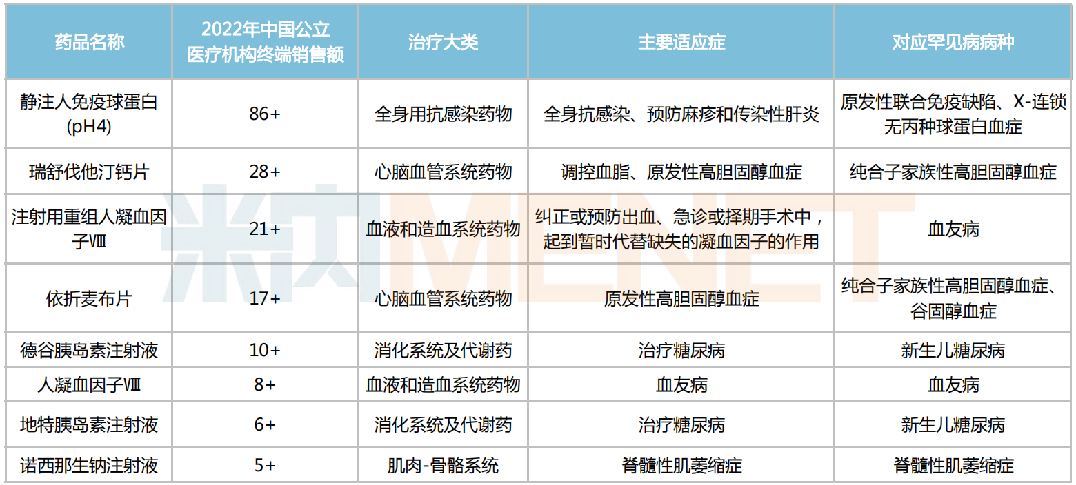 米内网数据显示,60个罕见病药中有8个在2022年中国城市公立医院、县级公立医院、城市社区中心以及乡镇卫生院(简称中国公立医疗机构)终端销售额超过5亿元,包括静注人免疫球蛋白(pH4)、瑞舒伐他汀钙片、注射用重组人凝血因子Ⅷ、依折麦布片、德谷胰岛素注射液、人凝血因子Ⅷ、地特胰岛素注射液、以及诺西那生钠注射液。