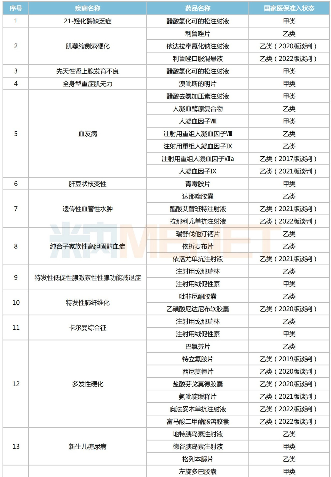 米内网数据显示,2009版国家医保目录包含22个罕见病药,覆盖13个罕见病;2017版国家医保目录包含30个罕见病药,覆盖15个罕见病;2019版国家医保目录包含39个罕见病药,覆盖19个罕见病;2020版国家医保目录包含45个罕见病药,覆盖23个罕见病;2021版国家医保目录包含53个罕见病药,覆盖26个罕见病;2022版国家医保目录包含60个罕见病药,覆盖27个罕见病。