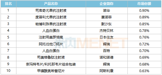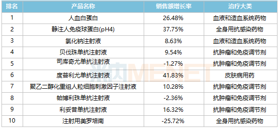 产品TOP10中,人血白蛋白、静注人免疫球蛋白(pH4)、氯化钠注射液位居前三,度普利尤单抗注射液增速最快,超过40%。