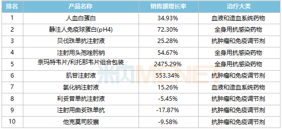 产品TOP10中,人血白蛋白、静注人免疫球蛋白(pH4)、贝伐珠单抗注射液位居前三,奈玛特韦片/利托那韦片组合包装成为“黑马”跃升至第五位,增速达2475.29%,此外,肌苷注射液增速也超过500%。