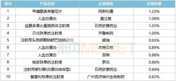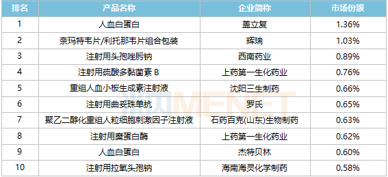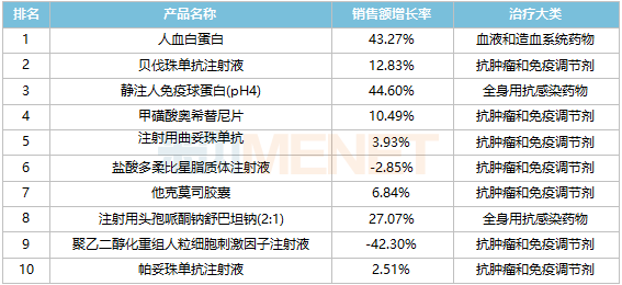 产品TOP10中,人血白蛋白、贝伐珠单抗注射液、静注人免疫球蛋白(pH4)位居前三,其中,人血白蛋白和静注人免疫球蛋白(pH4)增速均超过40%,帕妥珠单抗注射液晋身前十。