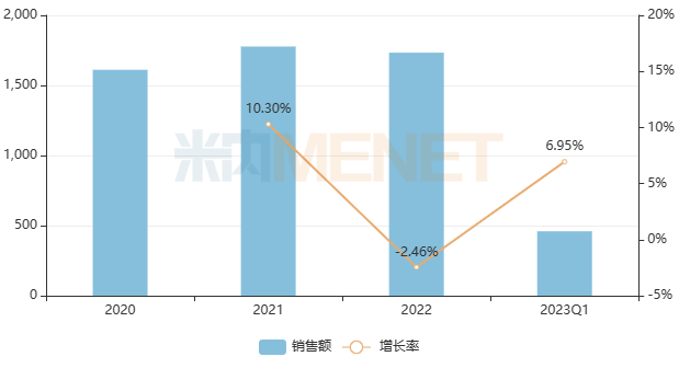 2023年一季度上海市公立医院终端化学药销售额超过40亿元,同比增长2.06%。TOP3治疗大类抗肿瘤和免疫调节剂、全身用抗感染药物、血液和造血系统药物的市场份额合计占比超过50%;感觉系统药物销售额增速最快,超过40%。