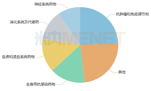 从大类格局来看,抗肿瘤和免疫调节剂、全身用抗感染药物、血液和造血系统药物、消化系统及代谢药、神经系统药物位居前五,合计市场份额占比超过70%。