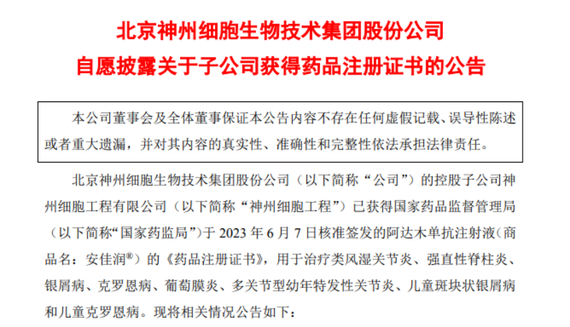 6月12日,神州细胞宣布国家药品监督管理局(NMPA)已正式批准公司自主研发阿达木单抗注射液上市申请。至此我国已有7家企业成功仿制阿达木单抗注射液,分别为百奥泰、海正生物、信达生物、上海复宏汉霖、正大天晴、君实生物/众合生物以及神州细胞。