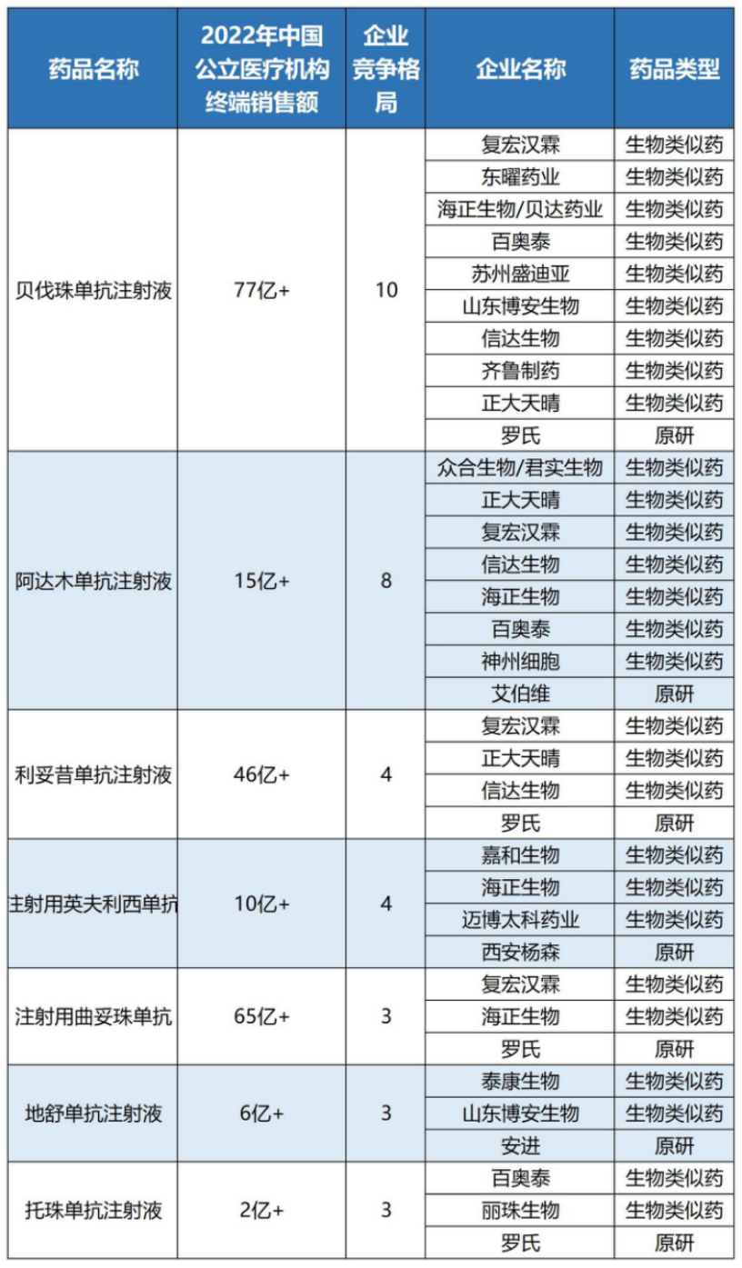 据不完全统计,国内生物药及生物类似药获批企业≥3家的品种有7个,包括贝伐珠单抗注射液、注射用曲妥珠单抗、利妥昔单抗注射液、阿达木单抗注射液、注射用英夫利西单抗、地舒单抗注射液以及托珠单抗注射液。