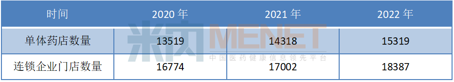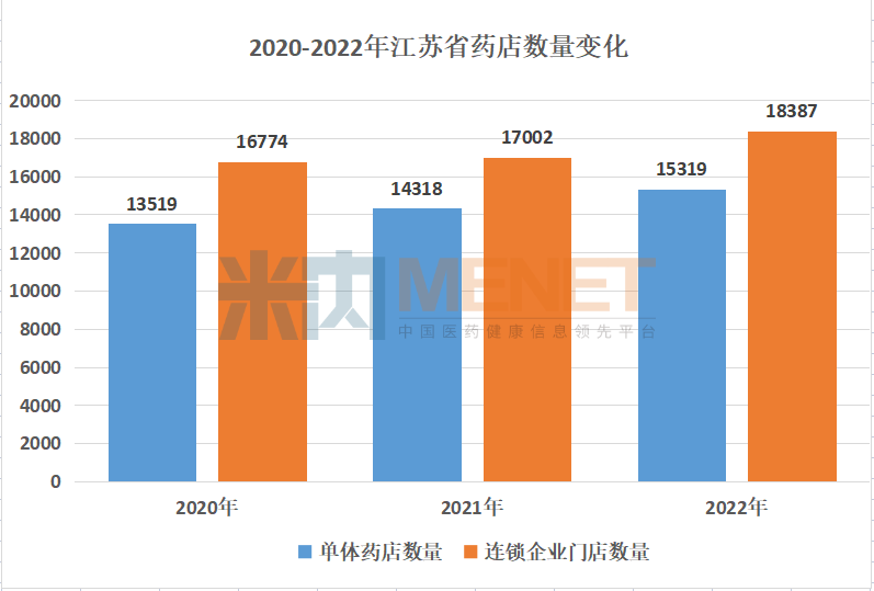 查询往年的数据得知,近年来,江苏的单体药店数量一直保持着稳定增长,2020-2022年三年间,江苏单体药店的数量分别为13519家、14318家、15319家,2021年比上一年增加了799家,2022年比去年增加了1001家,增长速度加快。