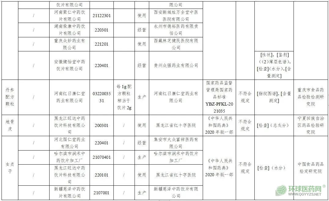 经中国食品药品检定研究院检验,标示为河北国仁堂药业有限公司、哈尔滨市润禾中药饮片加工厂、黑龙江旺达中药饮片科技有限公司、新疆恩泽中药饮片有限公司生产的4批次女贞子不符合规定,不符合规定项目为水分。