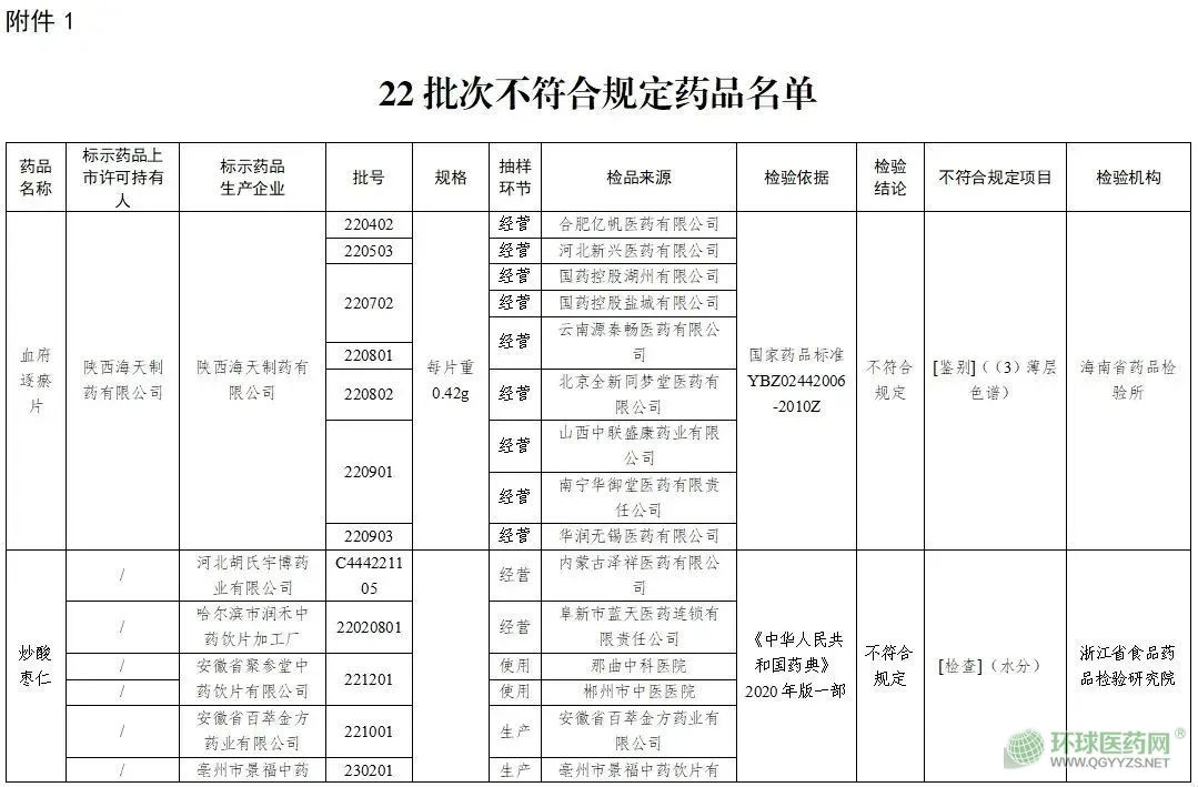 附:1. 22批次不符合规定药品名单