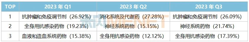 从获批的首仿药大类情况来看,一季度抗肿瘤和免疫调节剂较多,二季度则是消化系统及代谢药较多,三季度继续由抗肿瘤和免疫调节剂领先。