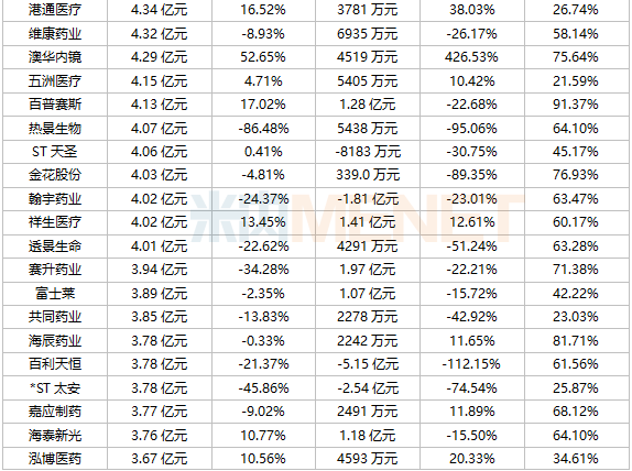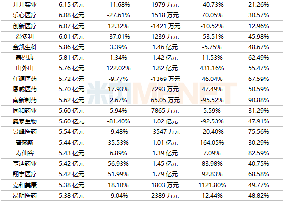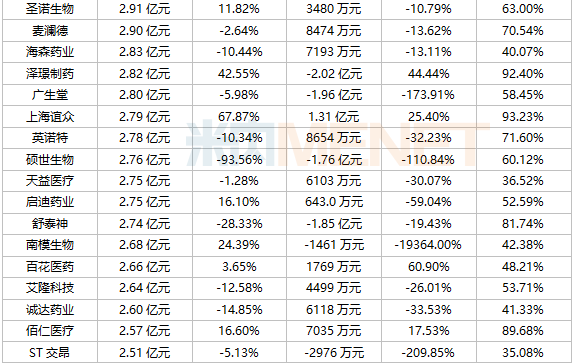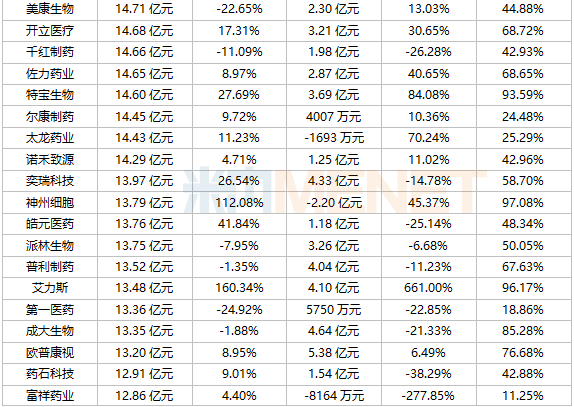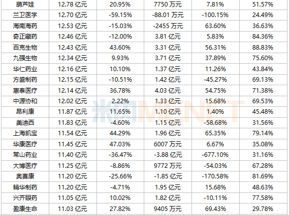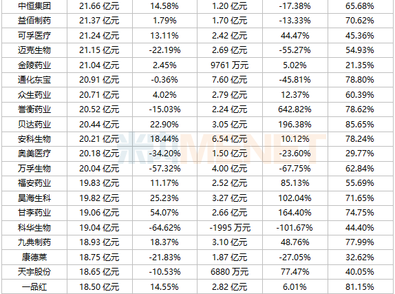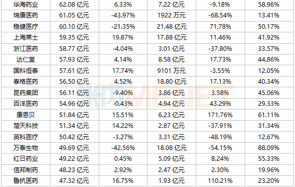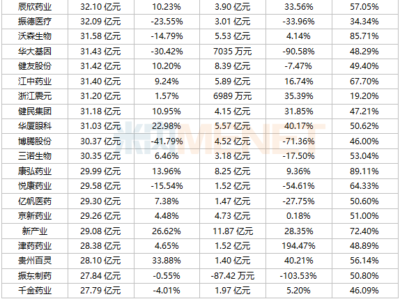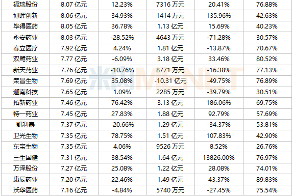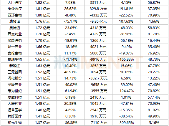 从净利润来看,17家超20亿元,去年同期有23家。医药股一哥迈瑞医疗已超过去年全年,逼近100亿元大关,鲁抗医药、亚宝药业、赛隆药业等超过40家翻倍,三生国健以13826%成为增速王。此外,有75家企业亏损。