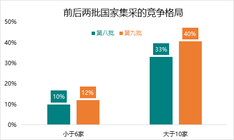 第九批国家集采的竞争激烈程度远远超过第八批集采。据统计,第九批国家集采共42个品种,符合申报资格企业数≥10的品种数达17个,约占40%,战况激烈;符合申报资格企业数≤6的品种数则和第八批集采基本持平。