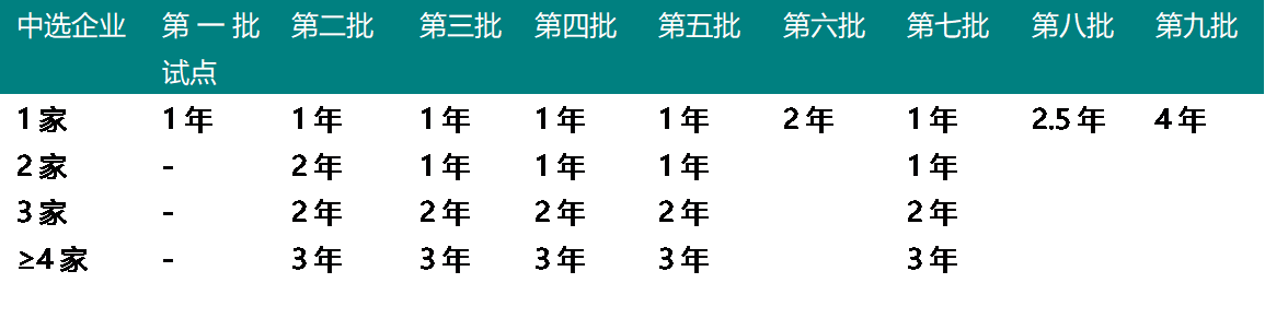 集采最早期是“以结果执行日起12个月作为一个采购周期”,其后又根据中标企业数细化对应采购周期。今年的第八批集采,采购周期则统一为两年,目前第九批的标期又进一步延长至四年。
