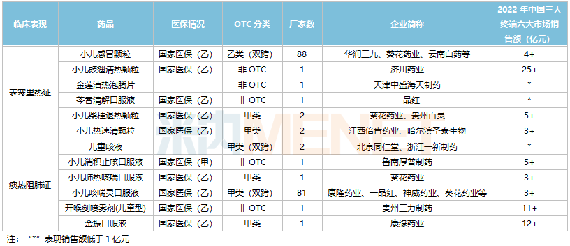 7款中成药为独家品种,包括济川药业的小儿豉翘清热颗粒、鲁南厚普制药的小儿消积止咳口服液、葵花药业的小儿肺热咳喘口服液、贵州三力制药的开喉剑喷雾剂、康缘药业的金振口服液、天津中盛海天制药的金莲清热泡腾片。