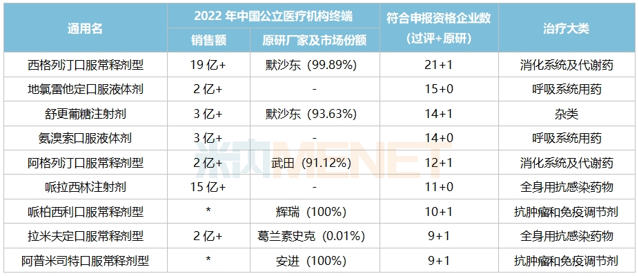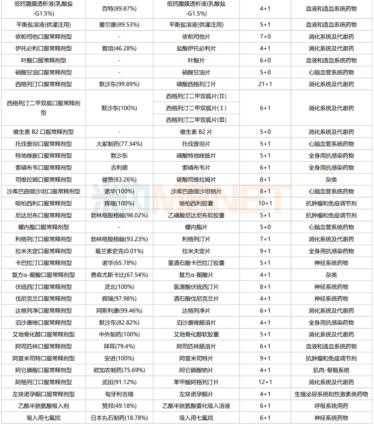 跨国企业中,默沙东、诺华、辉瑞、葛兰素史克、百特等企业均有多个品种在列。在西曲瑞克注射剂、西格列汀口服常释剂型、西格列汀二甲双胍口服常释剂型、舒更葡糖注射剂、沙库巴曲缬沙坦口服常释剂型、曲伏前列素滴眼剂、哌柏西利口服常释剂型、尼达尼布口服常释剂型、利格列汀口服常释剂型、钆布醇注射剂、伏硫西汀口服常释剂型、伐尼克兰口服常释剂型、达格列净口服常释剂型、艾地骨化醇口服常释剂型、阿普米司特口服常释剂型、阿格列汀口服常释剂型等品种中,原研厂家的市场份额均超过90%。
