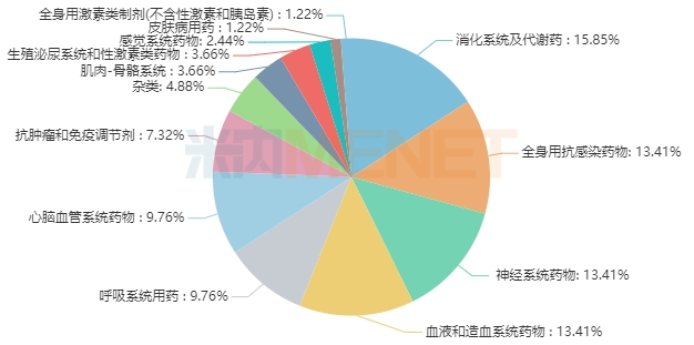 从治疗领域看,82个品种涵盖13个治疗大类,集中在消化系统及代谢药、全身用抗感染药物、神经系统药物和血液和造血系统药物,涉及的品种数分别达13、11、11、11个。