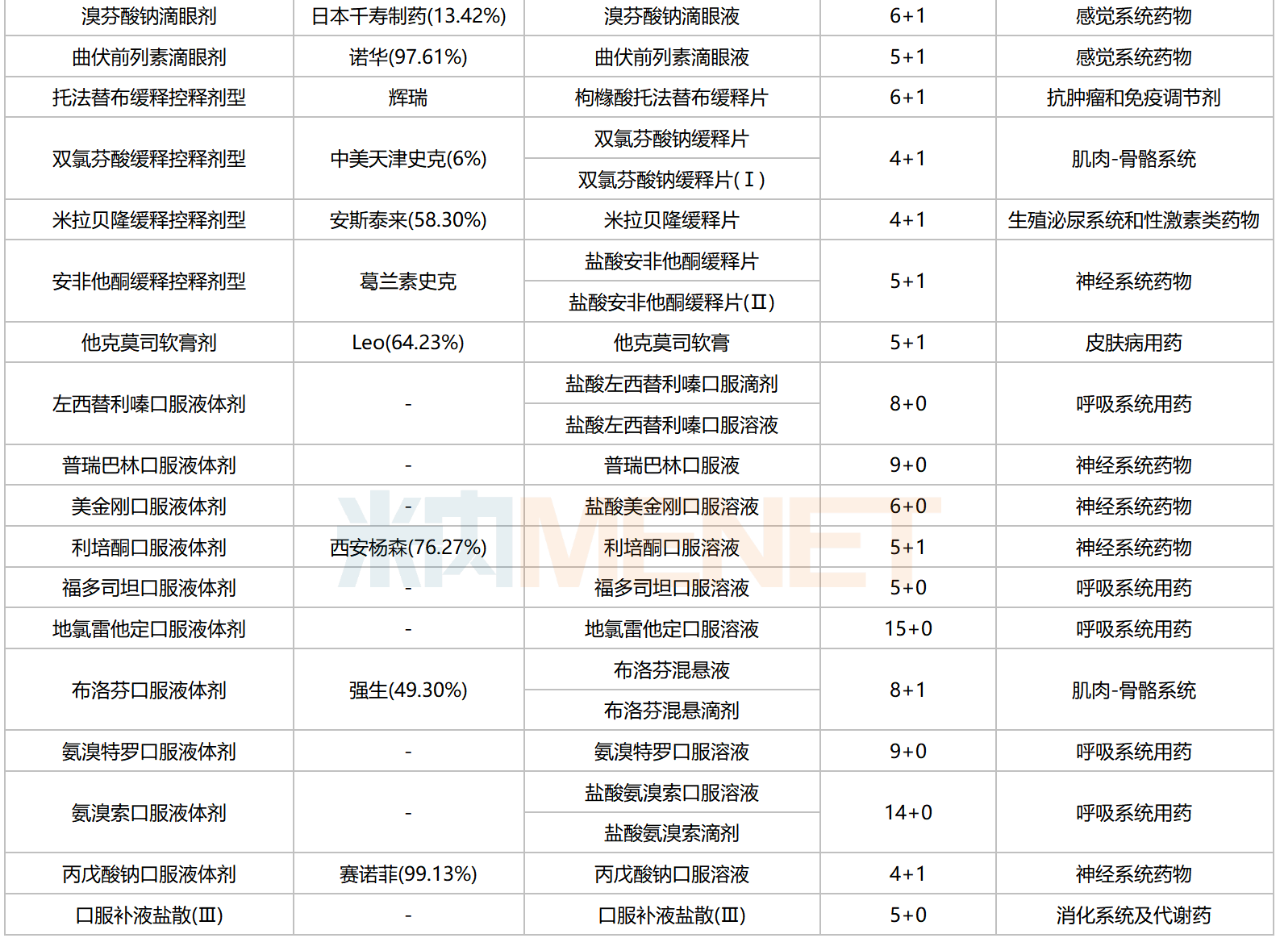 地氯雷他定口服液体剂、氨溴索口服液体剂均为呼吸系统领域的口服液体剂,目前符合申报资格企业数分别达15家、14家。在第九批集采正式名单尚未发布之前,这2个品种就已达到集采的门槛,但最终未被纳入。目前已纳入国家集采的呼吸系统化药中,尚未出现口服液体剂的影子。