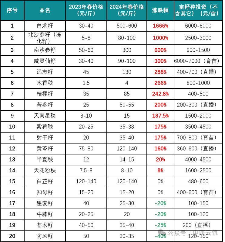 经过这三年中药材普涨的推动,不少种植户动辄亩收益过万元,更有甚者能达到3-5万元或更高,神奇的“造富”神话,使得2024年中药材种植热度空前高涨,多数籽种行情创造历史天价。