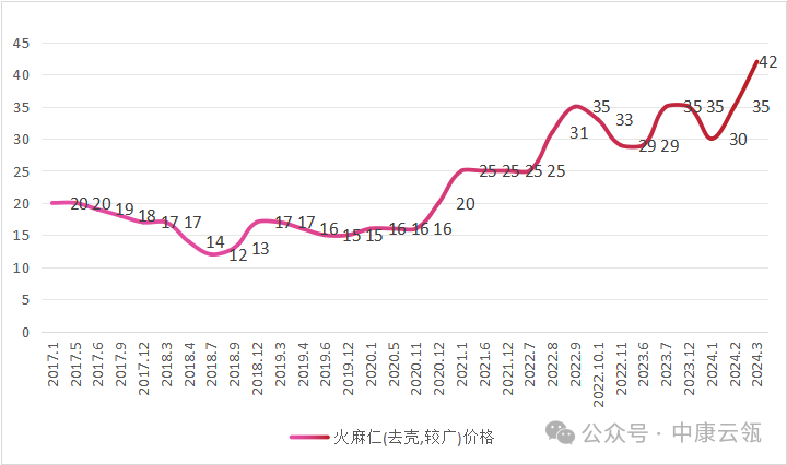 火麻仁(去壳)这几年的行情在25-35元(千克价,下同)之间震荡,进入2024年后,行情突然冲破40元大关,未来价格是否持续走高?