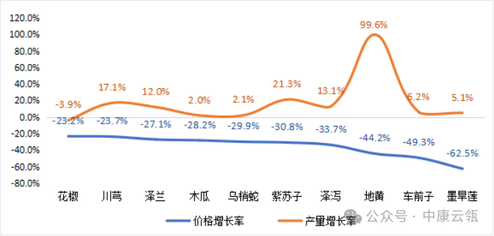 2023年,中康云瓴中药产业数据系统重点监测的133个药食同源品种中,涨价的品种有84个,平均涨幅37.2%,跌价品种42个,平均跌幅15.6%,7个价格持平。