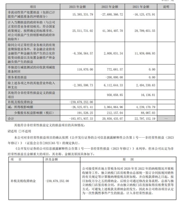 据一心堂公告披露,2023年,公司及各子公司接受所在地各主管税务局对2020年至2022年的纳税情况开展税收辅导工作,涉及缴纳税费合计2.33亿元,主要涉及税金为独立纳税门店房租等经营费用由总部统一签订合同按视同销售的有关规定计算缴纳增值税及附加税。上述相关税款自滞纳之日起,按日加收万分之五的滞纳金,以上税款缴纳涉及滞纳金7654.32万元。上述款项总计超3亿元。