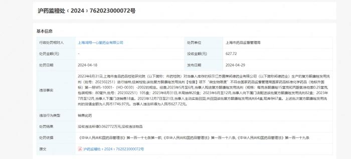 企查查显示,今年4月19日,一心堂旗下的上海鸿翔一心堂药业有限公司因销售劣药,被上海市药监局作出行政处罚。
