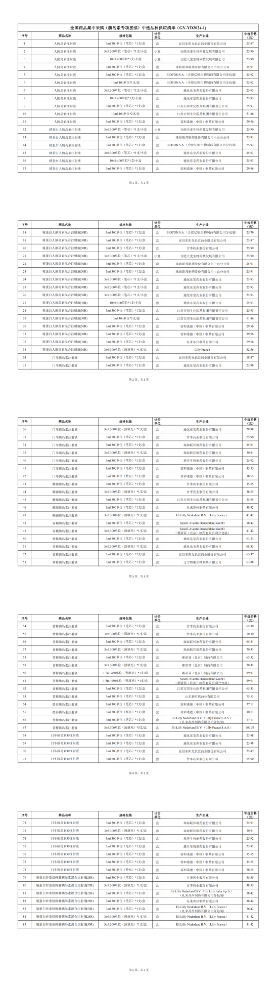 全国胰岛素专项接续中选药品挂网