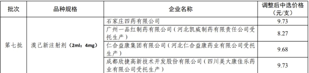 中新健康注意到,盐酸溴己新注射剂在第七批集采共有4家企业中标,除广州一品红制药有限公司(河北凯威制药有限责任公司受托生产),同批次中标该品种还包括石家庄四药有限公司、仁合益康集团有限公司(河北仁合益康药业有限公司受托生产)以及成都欣捷高新技术开发股份有限公司(四川美大康佳乐药业有限公司受托生产)。