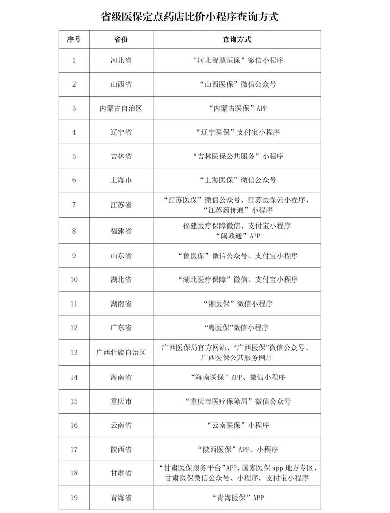 2024年7月份以来,先后有河北、山西、内蒙古、辽宁、吉林、上海、江苏、福建、山东、湖北、湖南、广东、广西、海南、重庆、云南、陕西、甘肃、青海等19个省(自治区、直辖市),以及浙江杭州、安徽黄山、河南周口、新疆阿勒泰等地市陆续推出覆盖全省或全市的定点药店比价小程序。群众可通过当地医保局APP、微信小程序、微信公众号、支付宝小程序等途径获取药品比价,实现药品价格在手机上一键查询、实时比对和位置导航,同时部分省份定点药店比价程序还提供了库存信息展示、异常价格提醒、价格趋势分析等相关功能,对此群众反响热烈、积极支持。