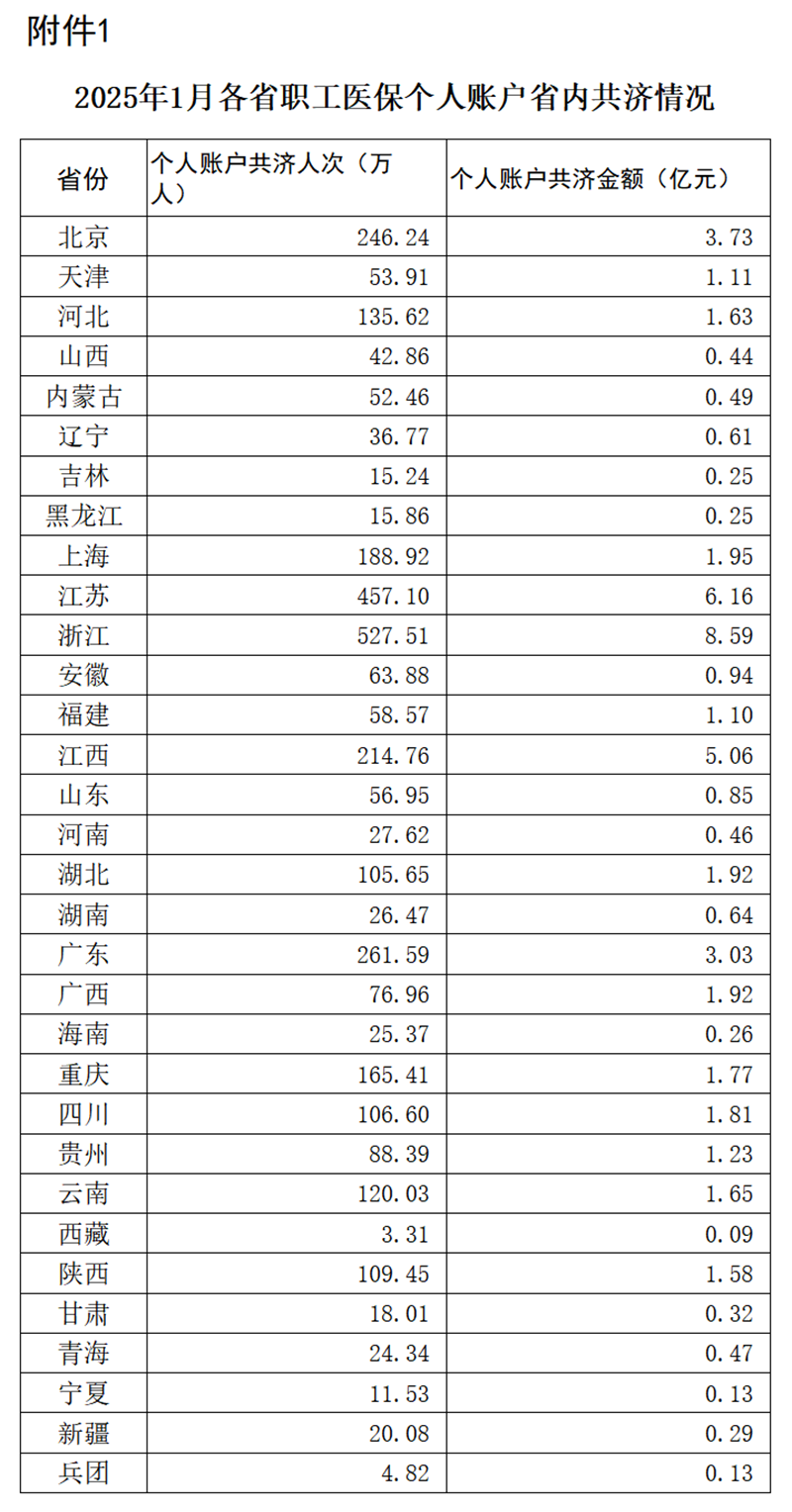 2025年1月,通过即时调用被绑定人个人账户方式进行职工医保个人账户省内共济的人次3362.31万,共济金额50.84亿元。