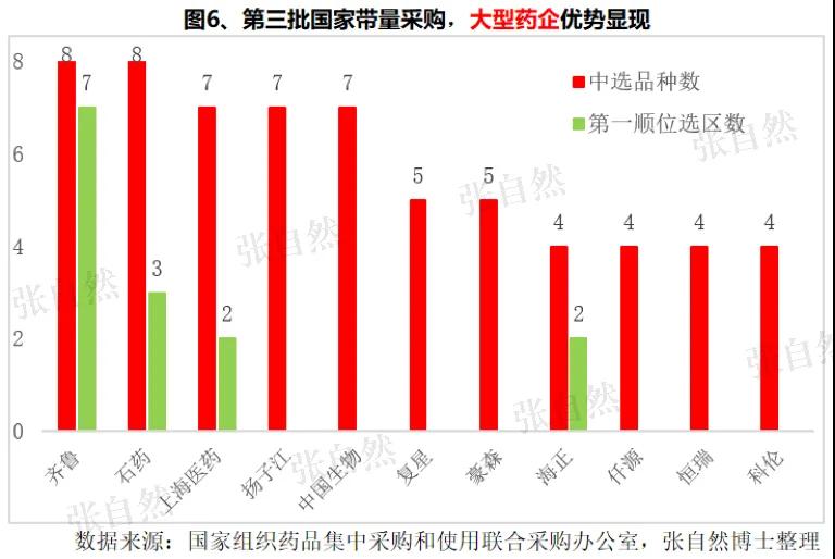 本次国采的另一亮点是头部企业表现亮眼,在190多个中选的产品中,有130多个来自百强医药企业,占近7成。其中齐鲁、石药各8个中选,上海医药、扬子江和中国生物制药都有7个中选。而且在供应区域优先权方面,大型企业优势更加明显,如齐鲁有7个品种获得第一顺位选择权,石药有3个、上海医药有2个。