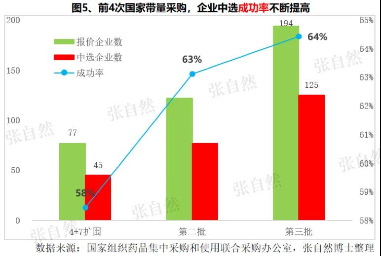 随着带量采购以量换价效应的逐渐体现和应采尽采的趋势,企业不但对国采的参与度越来越高,而且成功率也不断提高。主要是投标企业报价的诚意越来越大,“4+7”扩围时,实际报价的企业共有77家,有品种中选的企业有45家,企业成功率为58%;第二批国采时有122家报价,有品种中标的达77家,成功率上升到63%;而本次成功率则进一步提升,实际报价的企业有194家,有品种中选的有125家,成功率又提升了1个百分点,达64.4%。
