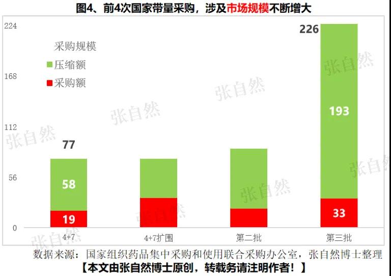 随着带量采购进入常态化,每次国采涉及的市场规模和挤出的“水分”也越来越大。“4+7”开始试点时涉及的市场规模只有77亿元,实际中标采购规模只有19亿元,初略计算压缩市场空间约58亿元。以后则逐渐增大,第二批国采涉及市场规模88亿元,招标结果实际采购规模为22亿元,压缩了60多亿元。而本次则进一步放大,涉及市场规模高达226亿元,实际采购额仅剩30亿元多一点,压缩了近200亿元。当然,采购带量的市场效应比这些具体数字还要大得多,国采对市场的挤出效应还将进一步放大。