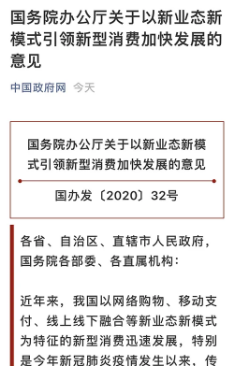 近年来,我国以网络购物、移动支付、线上线下融合等新业态新模式为特征的新型消费迅速发展,特别是今年新冠肺炎疫情发生以来,传统接触式线下消费受到影响,新型消费发挥了重要作用,有效保障了居民日常生活需要,推动了国内消费恢复,促进了经济企稳回升。但也要看到,新型消费领域发展还存在基础设施不足、服务能力偏弱、监管规范滞后等突出短板和问题。在常态化疫情防控条件下,为着力补齐新型消费短板、以新业态新模式为引领加快新型消费发展,经国务院同意,现提出以下意见。