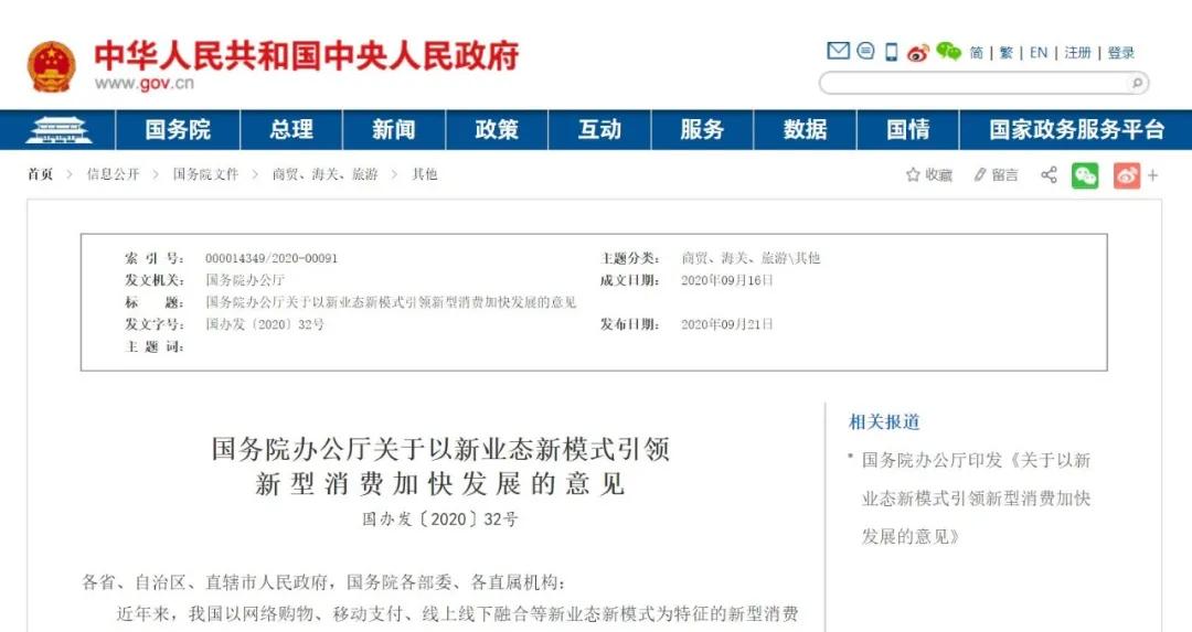 医药网9月23日讯 9月21日,中国政府网官方发布国务院办公厅印发的《关于以新业态新模式引领新型消费加快发展的意见》(简称《意见》),随后中国政府网官方微信于9月22日同步全文转发了这一政策通知。