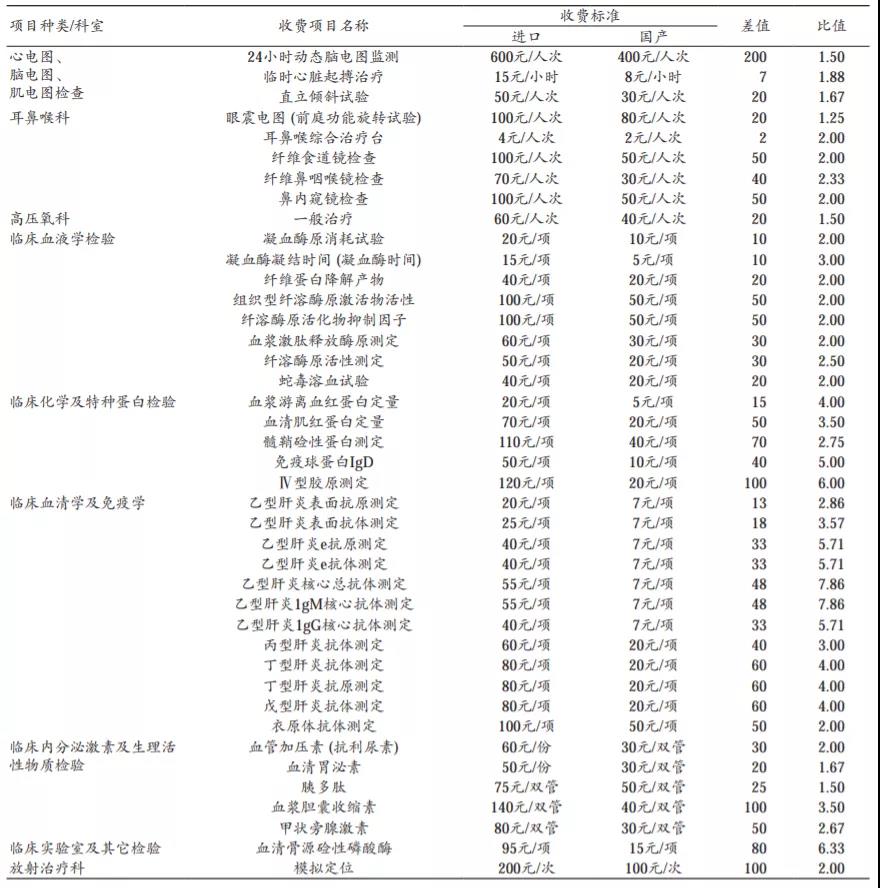 使用进口医疗器械和使用国产医疗器械收费有差异的部分项目表