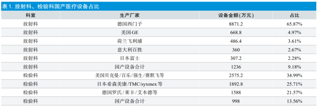 从上表可以看出,上述三甲医院放射科国产设备金额占比不足10%,超过90%均为进口设备,包含西门子、GE、飞利浦等跨国械企;检验科国产器械金额占比不足15%,超过85%均是进口器械,包含贝克曼、强生、赛默飞等跨国械企。